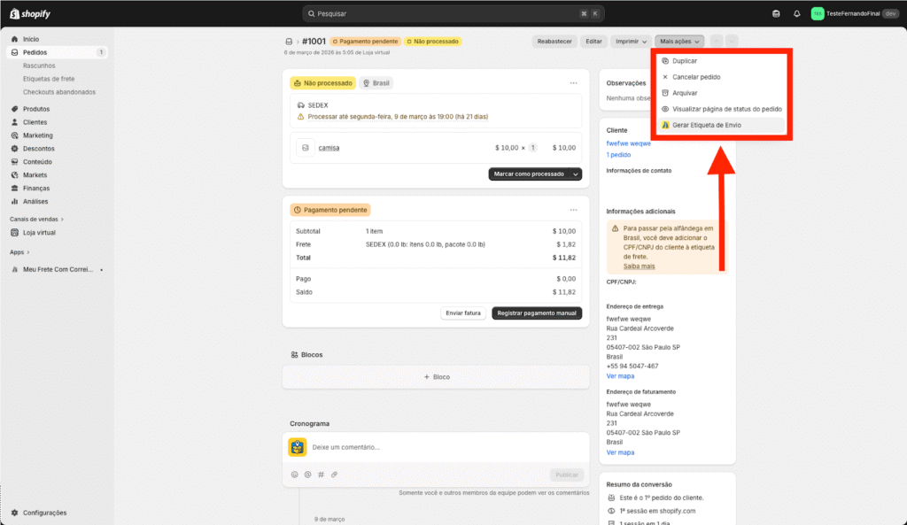 3. Na tela do pedido, clique na opção Mais ações no menu superior do lado direito e em seguida Gerar Etiqueta de Envio.
