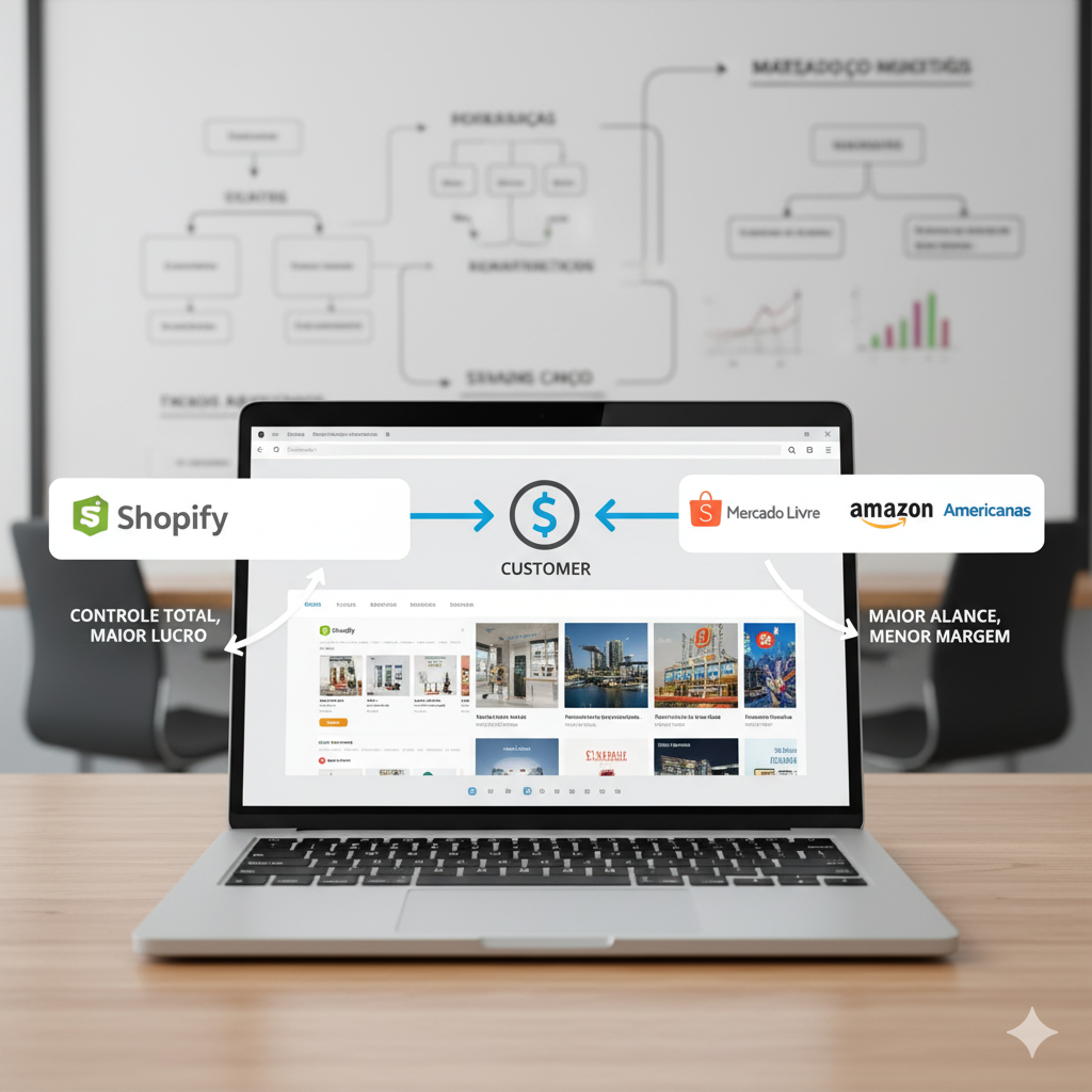 Quando um empreendedor decide vender online, surge uma das grandes dúvidas: devo abrir uma loja própria (como no Shopify) ou vender diretamente em marketplaces (Mercado Livre, Shopee, Americanas etc.)?